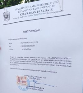 Sementara itu, dalam selembar Surat Pernyataan yang dibuat oleh Lurah Paal Satu, tertulis bersedia mencabut SKT Nomor: 594/001/SKT/Kel.PS/1/2023 tanggal 4 Januari 2023, dengan luas +8.234,75 M² atas nama Iwan Sahie (bertindak untuk dan atas nama selaku kuasa ahli waris alm. Simon Thesiadi) yang terletak di Jalan Bintara Dalam, RT 012/009, Kelurahan Paal Satu Kecamatan Tanjungpandan, Kabupaten Belitung. Setelah diterimanya Advis Bupati Belitung.