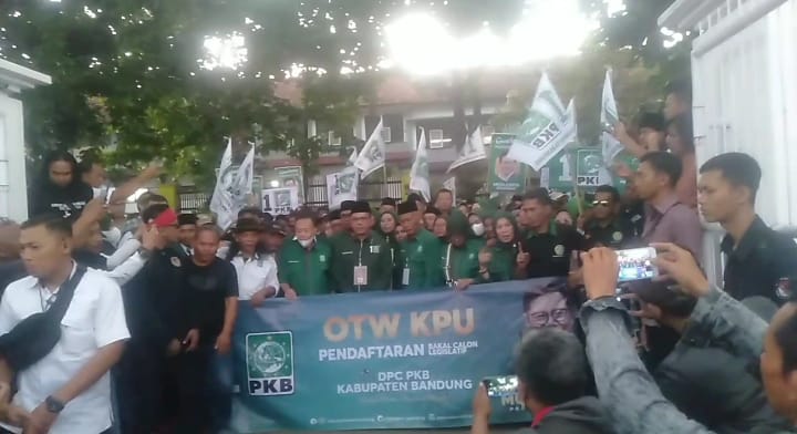 Rombongan dari PKB mendatangi Kantor KPU yang di iringi Drumband dan Show of Force 1.500 Kader PKB Kab. Bandung mendaftarkan 55 bakal calon legislatif ke Kantor KPU.