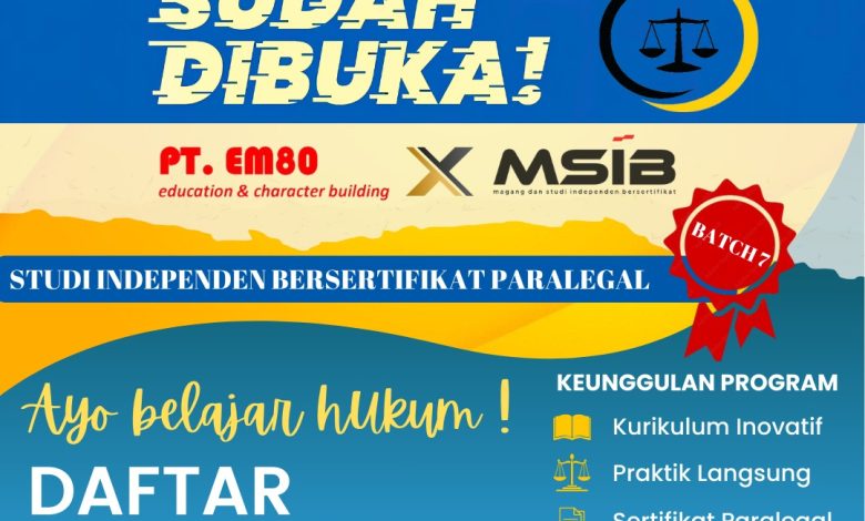 Bagi Anda, mahasiswa D3/D4/S1 di seluruh pelosok Indonesia, inilah saatnya untuk meraih kesempatan luar biasa ini. Bergabunglah dalam Program Studi Independen Bersertifikat (SIB) Kampus Merdeka Batch 7 di PT EM80! Dengan bergabung, Anda akan dibimbing menuju puncak kecakapan dan kesuksesan hukum melalui sertifikasi Paralegal Society 5.0.