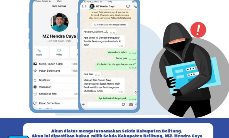 BELITUNG, sendikatbabel.com – Sekda Kabupaten Belitung, MZ. Hendra Caya mengkonfirmasi bahwa adanya upaya penipuan yang mengatasnamakan dirinya. Hal ini disampaikan dirinya usai beredar informasi adanya akun yang mengatasnamakan dirinya melalui aplikasi Whatsapp.