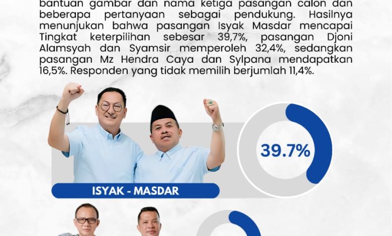 Paslon nomor urut 1, Djoni Alamsyah dan Syamsir, berada di posisi kedua dengan 32,4%, diikuti oleh pasangan nomor urut 3, MZ Hendra Caya dan Sylpana, yang hanya memperoleh 16,5%. Sementara itu, 11,4% responden menyatakan belum menentukan pilihan atau tidak akan memilih.