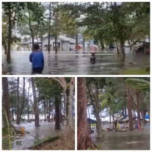 BELITUNG, SENDIKATBABEL.COM – Kondisi Pantai Tanjung Pendam, salah satu destinasi wisata andalan di Belitung, digenangi air akibat pasang laut. Beberapa titik di sekitar daratan, seperti jalan, area lapangan, hingga pinggir pantai, terendam air hingga setinggi betis orang dewasa. Fenomena ini memaksa warga untuk mengarungi air yang menggenang untuk beraktivitas, Selasa (17/12/24).
