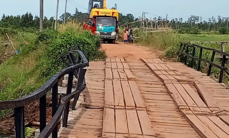 Namun baru beberapa Minggu baru selesai dikerjakan jembatan sudah rusak dan tiang penyangganya patah akibat dilalui oleh alat berat (PC) yang berat bobotnya kurang lebih 20 ton.